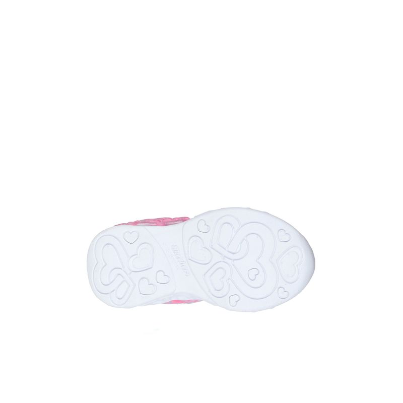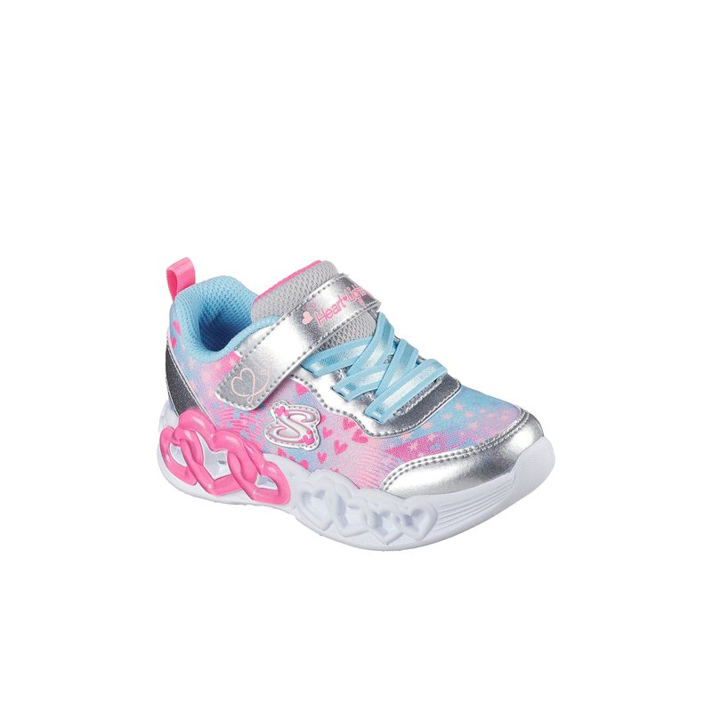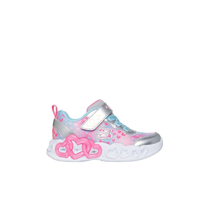 Brilla con magia y estilo con las Skechers Heart Lights® Infinite Heart Lights - Heart Jewels. Este modelo, con cierre adaptativo, cuenta con una parte superior de malla brillante con estampado de corazones y estrellas combinada con superposiciones sintéticas, cordones elásticos fijos con charms en forma de corazón, una correa ajustable en el empeine y una mediasuela iluminada y moldeada con detalle de “cadena de corazones”.
