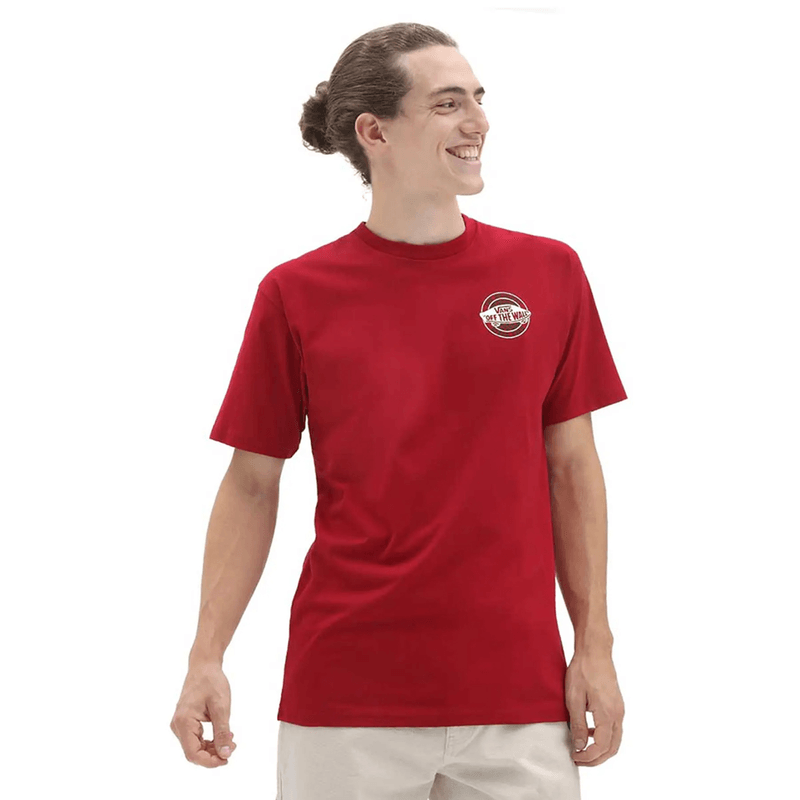 Esta camiseta Vans de manga corta terminará tu búsqueda de la camiseta perfecta para que puedas concentrarte en las cosas más importantes. Está diseñado con el detalle del logotipo de Vans en el lado izquierdo del pecho y en el centro de la espalda. Esta camiseta roja está hecha de 100 % algodón y presenta "Vans Off the Wall The Original Since 1966".